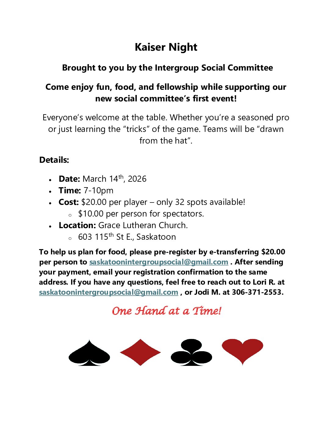 Brought to you by the IG Social Committee, Cost: $20.00/person, Only 32 spots available, $10.00/person for spectators. To help plan for food, please pre-register by e-transferring $20.00 to saskatoonintergroupsocial@gmail.com. Contacts: ...