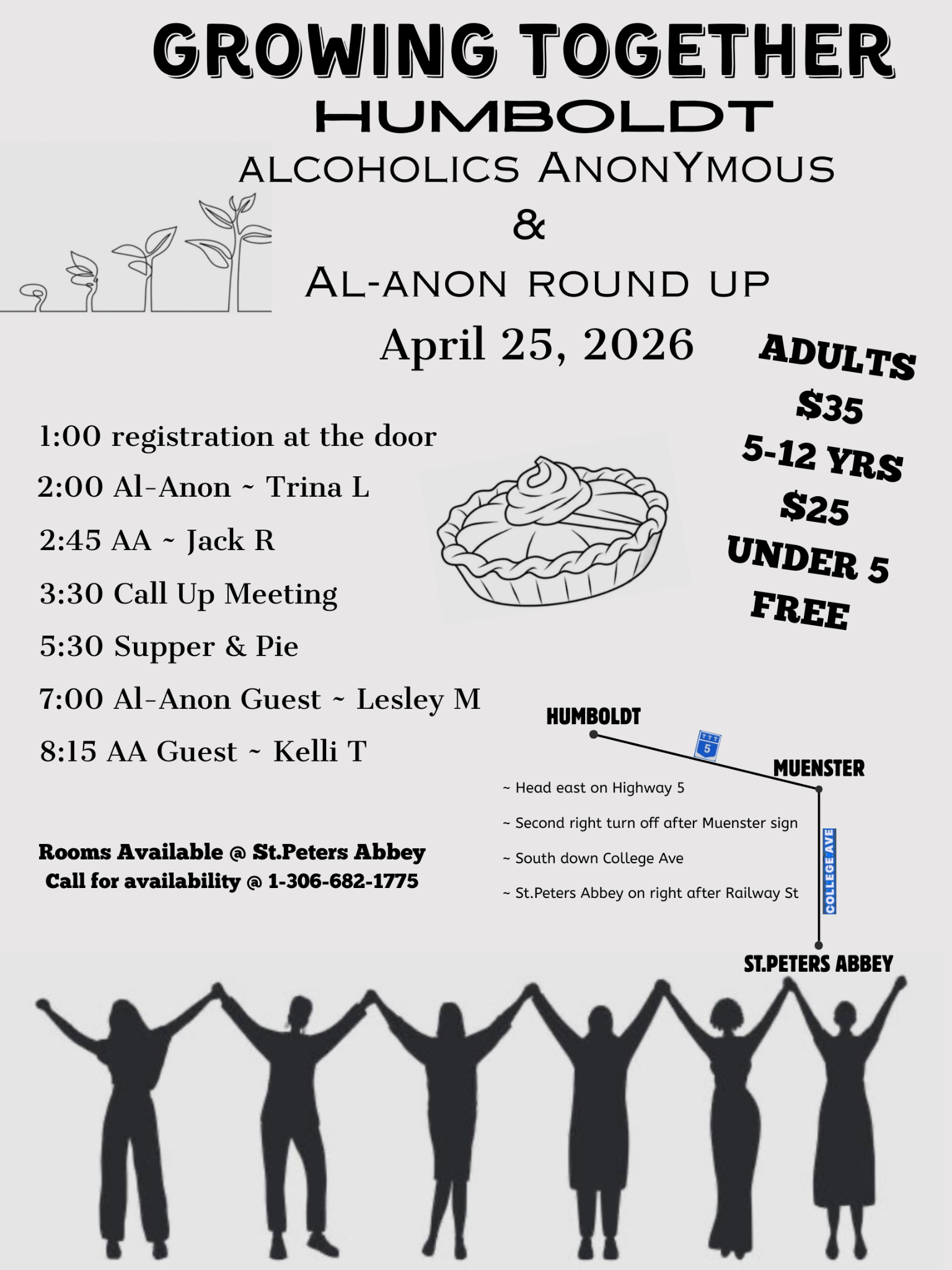 AA & Al-Anon. Rooms available @ St Peters Abbey. Call for availability @ 1-306-382-1775. Adults: $35.00. 5-12 years: $25.00. Under 5 years: Free,