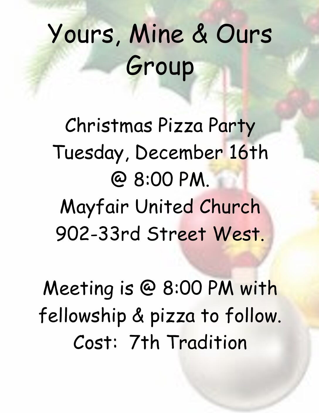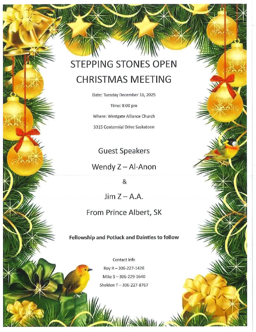 Guest Speakers: Wendy Z (Al-Anon) & Jim Z. (AA), Fellowship, Potluck & Dainties to follow. Contact Info: Roy R. (306-227-1426), Mike S. (306-229-1640), Sheldon T. (306-227-8767)